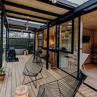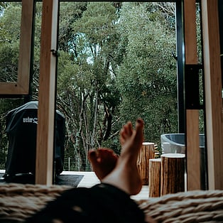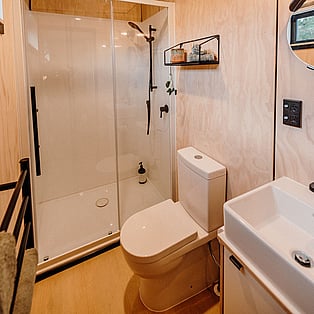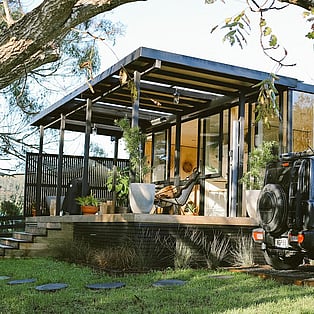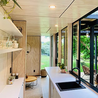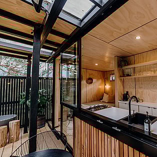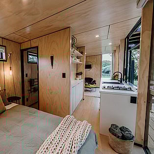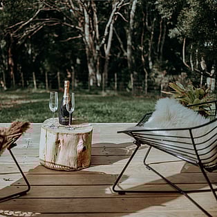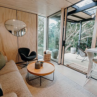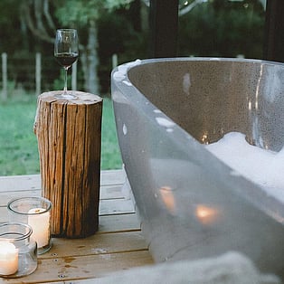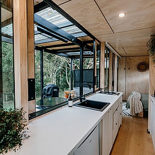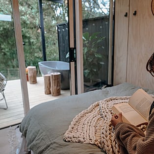Blackwood Cabin is a neatly designed tiny home; from the cosy lounge looking out into the trees, to the bedroom with a luxurious queen bed and the functionally crafted kitchen. The bathroom, which is off the bedroom has a generous size shower, and heated towel rail. The kitchen windows opens up onto the large covered deck and captures the beautiful view of the trees. The real show stopper here though, is the gorgeous stone bath on the large covered-in deck! Relax and enjoy!