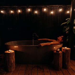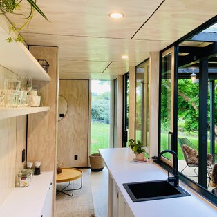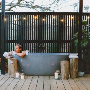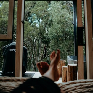 Blackwood Cabin is a neatly designed tiny home; from the cosy lounge looking out into the trees, to the bedroom with a luxurious queen bed and the functionally crafted kitchen. The bathroom, which is off the bedroom has a generous size shower, and heated towel rail. The kitchen windows opens up onto the large covered deck and captures the beautiful view of the trees. The real show stopper here though, is the gorgeous stone bath on the large covered-in deck! Relax and enjoy!